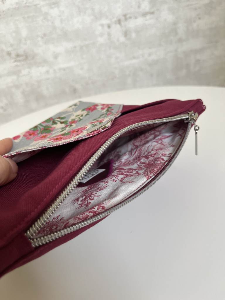 De eerste dame die ik wil bedankten is Karin. Zij was bijna drie jaar mijn bazin en ook al waren we toen enkel collega’s, we stonden samen sterk. Toen ze op pensioen ging, maakte ik een Mynta portefeuille van Hansedelli, in crèmekleurig kunstleer en blauw-grijze bloemencanvas van De Stoffenknop. Ik besloot het bloemenstofje opnieuw te gebruiken voor een ritstasje, gecombineerd met een leuke canvas van ZipperZoo. Een fleurig katoentje dat ik van Girl in Uniform Margot cadeau kreeg paste perfect als voerig.