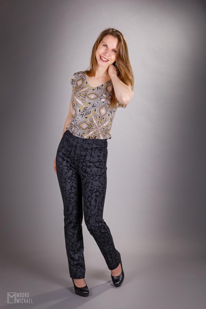 Ann van Designer Stitch hecht veel belang aan de perfecte pasvorm. Daarom krijg je in de werkbeschrijving een aantal tips om tot de perfecte broek voor jouw figuur te komen. Ik moest bijvoorbeeld twee centimeter toevoegen aan de zithoogte van de broek. Hoe je dat moet doen? Dat beschrijft Ann in de handleiding! Omdat geen enkel vrouwenlichaam hetzelfde is, raadt de designer je aan een proefversie te maken in een goedkope stof. Van daaruit kan je dan bekijken wat je nog moet aanpassen. Bij een broek zou ik je zeker hetzelfde aanraden. Er zijn dingen die je na het naaien nog goed krijgt, maar een aanpassing op patroon is altijd beter.