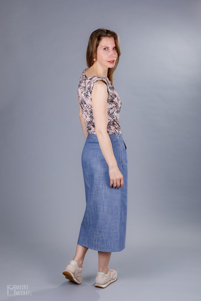 Gelukkig kon ik de rok wat uitnemen in de figuurnaden voor en achter, dus het euvel was snel opgelost. Maar ik heb meteen het patroon aangepast, zodat ik dezelfde fout niet meer maak. Verder verhuisde ik de blinde rits opnieuw naar de rechter zijnaad. Dat ben ik gewend van mijn broeken en ik vind het fijner dan een rits op de rug, die ik altijd toch een beetje voel zitten. Meer aanpassingen hoefde ik niet te doen.