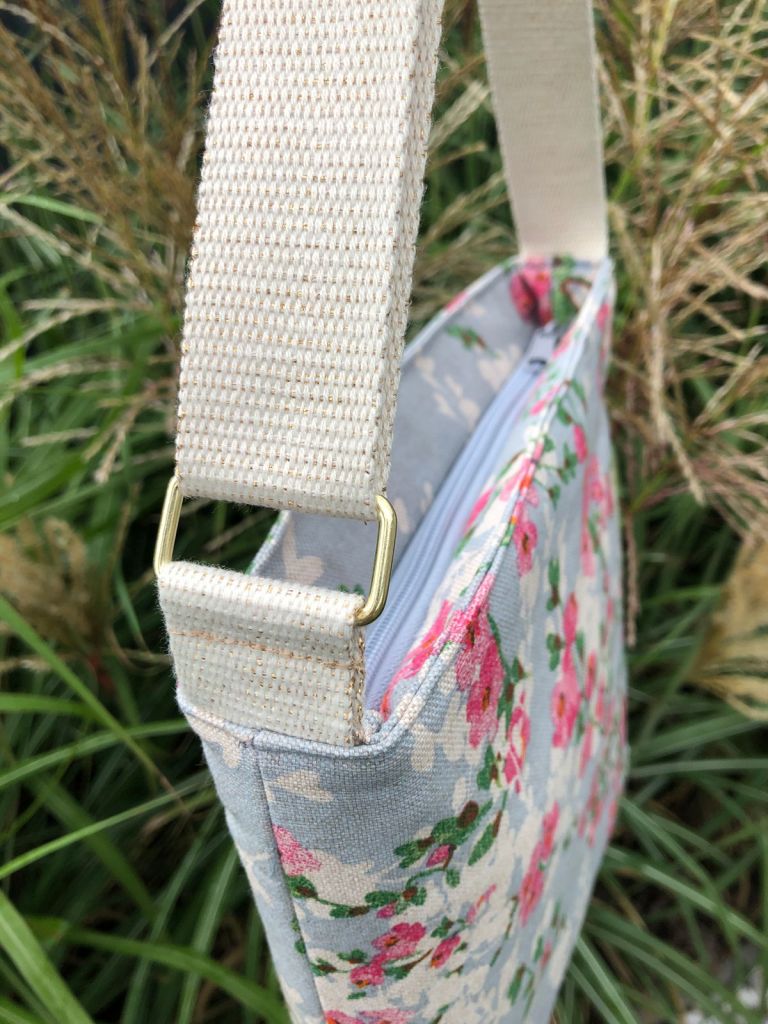 Haar Stinger viel in de smaak en ik had nog een stukje gebloemde canvas en grijs gebloemde katoen (De Stoffenknop) liggen. Daarbij kocht ik opnieuw een mooie grijze rits-op-rol en goud-gespikkelde tassenband (Toverstof). Never change a winning team, nietwaar?