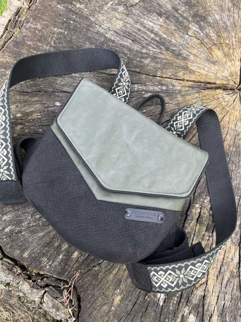 – Het groene kunstleer kocht ik lang geleden bij Toverstof. Ook de schitterende canvas van de binnentas vond ik daar.