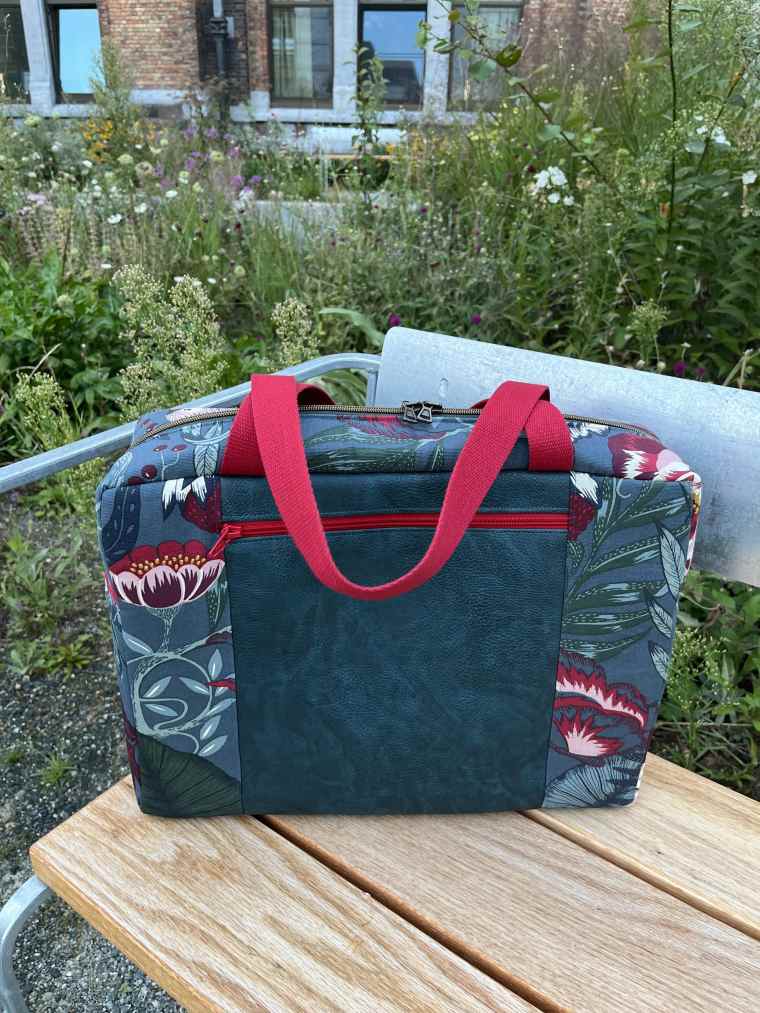 De materialen kocht Tatiana lang gelden. De kleurrijke canvas van de buitentas was er eentje van Ikea, uit de tijd dat de meubelgigant nog stoffen verkocht. Het mooie blauw-groene kunstleer, de tassenband en de paspel komen van Toverstof. Waar de binnenstoffen vandaan komen? Geen idee. Ik weet enkel dat het bleke stofje een oud gordijn was uit de slaapkamer van Tatiana. De rits en trekkers kocht ik bij ZipperZoo.