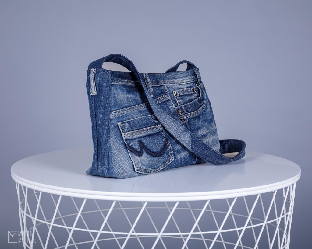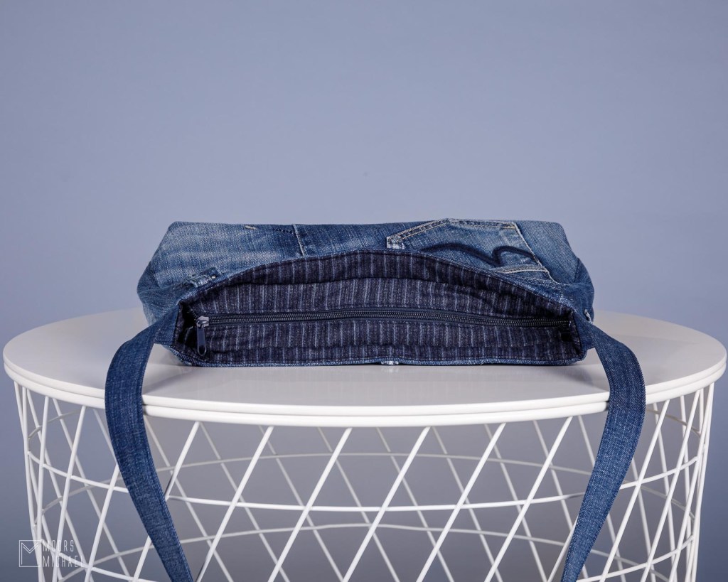Aan het eind van de rit heb ik nog slechts een paar kleine stukjes jeans over, want ik gebruikte zowat alles van de broek voor de buitentas. De riem maakte ik bijvoorbeeld uit drie verschillende stukken broekspijp, want een meter stof in één stuk, dat kon ik er niet uithalen. Het gebruik van de stukken jeans in verschillende richtingen en uit andere broeksdelen zorgt ervoor dat de tas een soort lappendeken is geworden. De kleurschakeringen van de broek maken er iets heel bijzonders van.