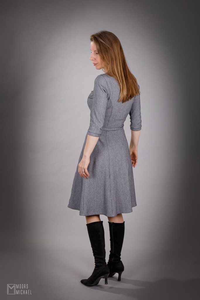 De kenmerkende V in de halslijn van de Harriet tekende ik voor de gelegenheid rond. Ooit maak ik de jurk wel nog eens zoals ze werd ontworpen, maar onder mijn zwarte mantel vond ik een ronde hals toch iets mooier. Voor de begrafenis was dat niet van toepassing natuurlijk, maar bovendien kan je een rond halslijn mooier ‘pimpen’ met een juweeltje of een sjaaltje. Op die manier werd de jurk makkelijker combineerbaar en dus veelzijdiger.
