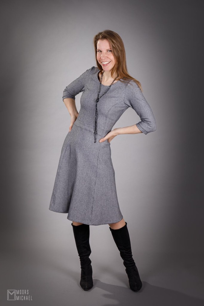 De Stoffenknop doet op dit moment uitverkoop, maar toen kocht ik er een hele mooi kwaliteit french terry in een middengrijze tint. De stof is steviger de gemiddelde tricot en leent zich perfect voor een jurk zoals de Harriet. De rok valt daardoor net iets minder soepel en dat geeft een chique effect.