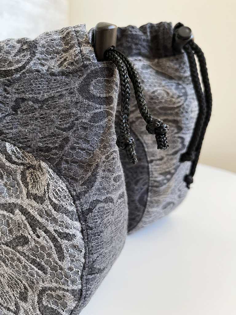 Ook de voering maakte ik uit resten. Aangezien de binnen- en de buitenkant van de Encircle Pouch identiek is qua patroon, gebruikte ik ook voor mijn voering twee verschillende stofjes. Een leuk katoentje dat ik ooit kocht bij Veritas, en een lichte zwarte canvas, geen idee waar die vandaan kwam.