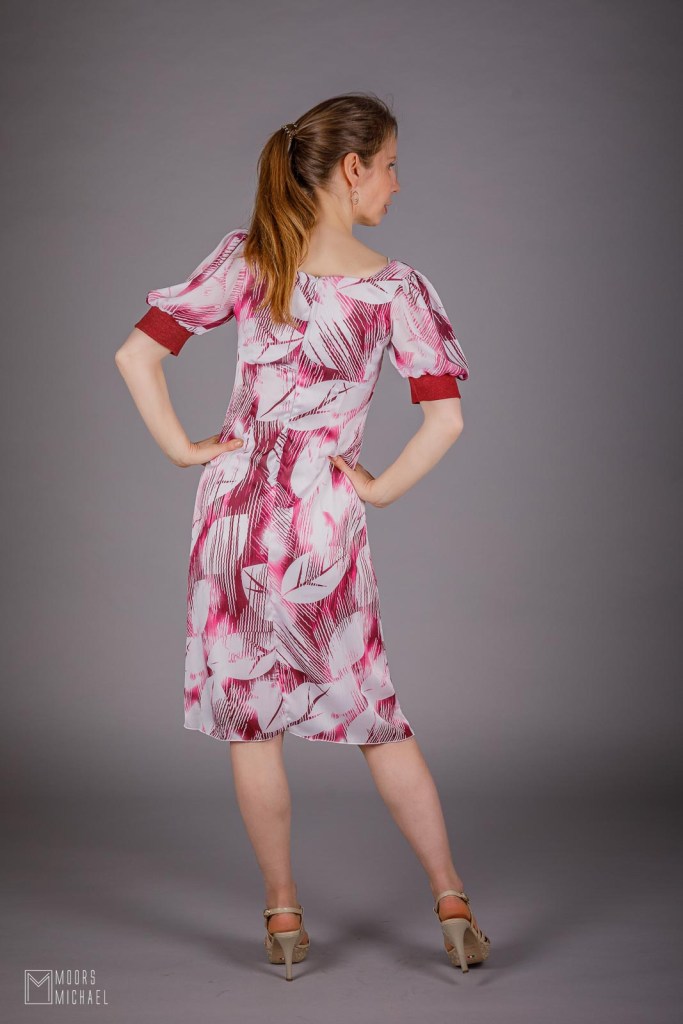 De aanpassingen waren een gok, want ik heb geen idee of er regels zijn hoe je een patroon moet aanpassen in functie van het stretchgehalte. In het hele patroon besloot ik een halve centimeter meer naadwaarde te knippen voor meer beweegruimte. De mouwtjes korte ik een stuk in en liet ik poffen met een stukje bijpassende boordstof, gekregen uit de voorraad van mijn ‘kleine zus’.