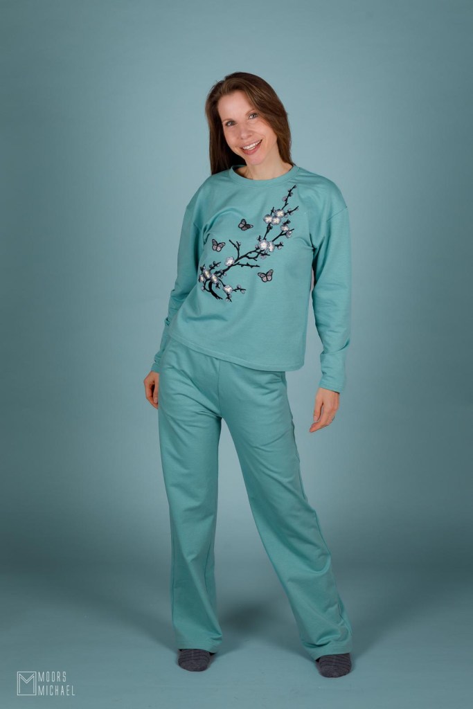 Voor mijn versie koos ik een ronde hals en lange mouwen en broekspijpen. Zo kan ik de set het hele jaar door dragen. Omdat ik de effen muntgroene stof een beetje fel vond, besloot ik een applicatie aan te brengen op het truitje. Die zorgt ervoor dat de aandacht naar meer getrokken wordt dan enkel de kleur van de outfit. Het geborduurde strijkembleem kocht ik bij Bol.com. Niet goedkoop, maar supermooi! Het brengt mijn outfit meteen in evenwicht.