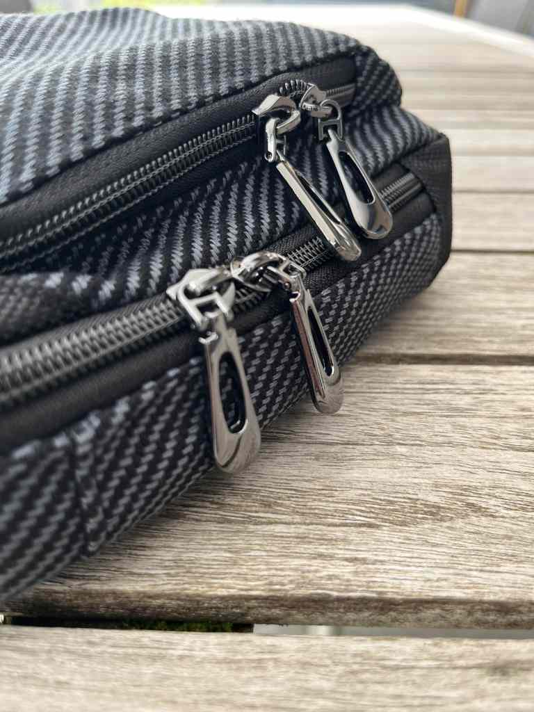 De materialen vond ik opnieuw bij mijn klassiekers: de buitenstof is een oudje van ZipperZoo, waar ik gelukkig een meter extra van kocht omdat ik de stof zo leuk vond. Ik combineerde die stof met een ‘gerecycleerde ritstas’ in polyester waar mijn schoonbroer vroeger zijn statieven in transporteerde. Jammer genoeg had ik nog slechts enkele kleine stukjes, maar als accentje past de polyester perfect in het plaatje. De ritsen, trekkers, klinknagels, rechthoekige ringen en de tassenband kocht ik opnieuw bij ZipperZoo. De voeringstofjes vond ik bij Veritas.