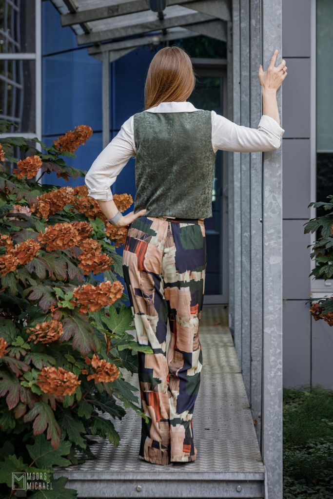 Omdat het kaki van het vestje mooi in de lijn ligt van het donkergroene in de broek, zag ik daar een toffe combinatie in. Deze zomer werden vestjes als deze gewoon als top gedragen, maar met de herfst op komst vind ik een laagje meer toch aangenaam. Daarom greep ik naar de Hannah blouse in papillon van Toverstof, ook van Designer Stitch, die ik al op heel wat gelegenheden droeg. Voor een iets stoerdere maar toch geklede look rolde ik de mouwen een paar slagen op.