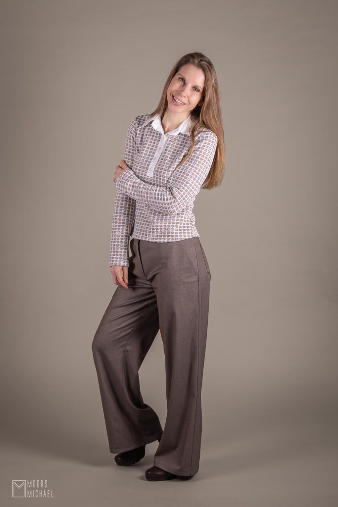 De polo combineerde ik met de zachtste broekenstof ever! Ze bestaat uit 31% viscose, 66% polyamide, 3% elastaan. Die mix zorgt voor een stevige, doch licht elastische broekenstof die opvalt door de makkelijke manier van verwerken. Ze kreukt nauwelijks tot niet en valt prachtig door. Ik kon ook kiezen uit heel wat verschillende kleuren, wat een perfect combinatie opleverde met de tricot van de top. Ideaal voor de broek die ik voor ogen had. In het magazine straalde broek 5 namelijk een eerder stoere look uit, maar in combinatie met deze geweldige A La Ville broekenstof werd het een heel chique exemplaar.