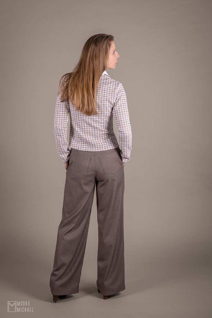 Ook de broek zat vrij snel in elkaar, maar de afwerking ging wat minder vlot. Ik pas na zowat elke naad en merkte al snel dat ik midden achter aan de onderrug wat stof te veel had. Daar moest ik in totaal vier centimeter innemen. Ook de eenvoudige rechte tailleband bleek niet goed te werken voor mijn holle rug. Dat loste ik op door een elastiek in de tailleband achter te steken. Zo ligt de tailleband mooi tegen mijn rug in plaats van te gapen, maar het geeft mij ook wat draagcomfort aan het einde van de dag, als mijn buik wat gezwollen is.