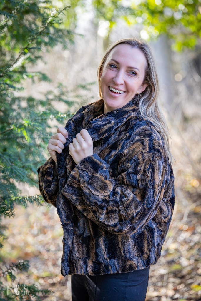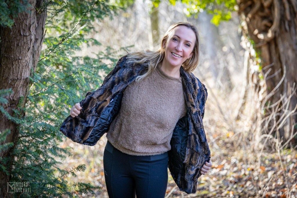 Vorig weekend was het eindelijk zover: we trokken richting Evergem voor de ‘officiële overhandiging’ en de bijhorende professionele fotoshoot. Het weer was perfect: koud maar zonnig, weinig wind. Katrien was nerveus, maar dankzij de aanmoedigingen van Michael en mij, en van talloze wandelaars die langs de boswegel passeerden, slaagde ze er wel in als een volleerd model te poseren. Zie hoe ze straalt in haar jasje!