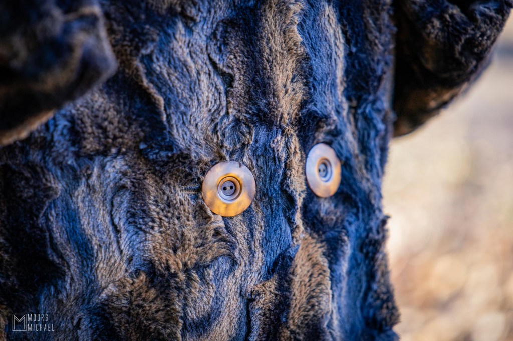 Er kwam een perfect knoopsgat van onder de machine, maar toen ik het vlies en de Avalon wegscheurde, raakte ik een aantal draadjes en begon het knoopsgat te rafelen. Natuurlijk merkte ik dat pas op nadat ik het had open gemaakt… Ik ging er nog eens over met een smalle zigzag, maar ‘als nieuw’ zal het nooit meer worden. Gelukkig zie je er niet veel van, met dank aan de honderden kleine bonthaartjes rond het knoopsgat. Nu maar hopen dat de ‘herstelling’ stevig genoeg is… Toen Katrien me vroeg of ik zelf tevreden was met het resultaat, kon ik dus jammer genoeg niet volmondig “ja” antwoorden.
