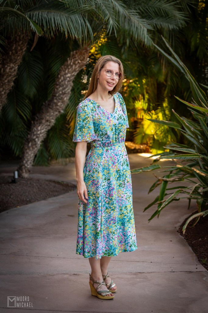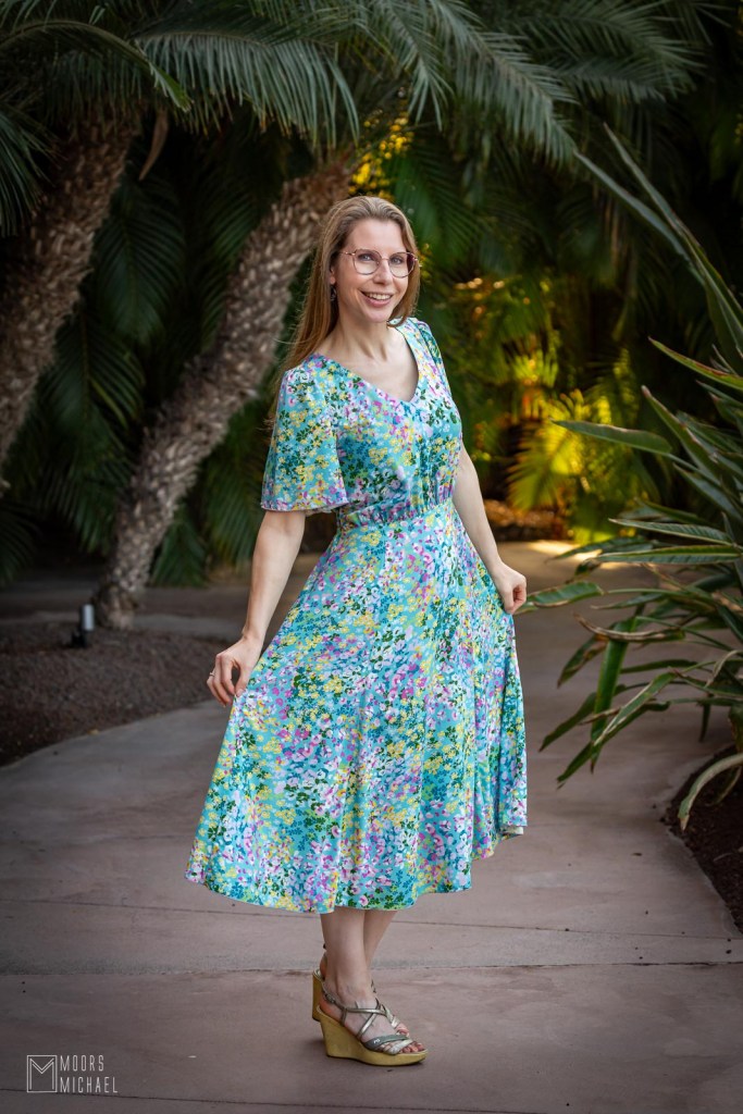 Het naaiproces verliep grotendeels vlotjes. Dankzij het voorbeeld van Tatiana op naaiweekend wist ik dat ik waarschijnlijk wat stof zou moeten wegnemen in het rugpand middenachter. En effectief: ook bij mij viel de hals achteraan open. Waarschijnlijk hebben wij allebei nogal smalle schouders :-). Gelukkig is een dergelijke ingreep snel en makkelijk. Verder moest ik niets aanpassen en vind ik dit een geweldig leuke jurk.
