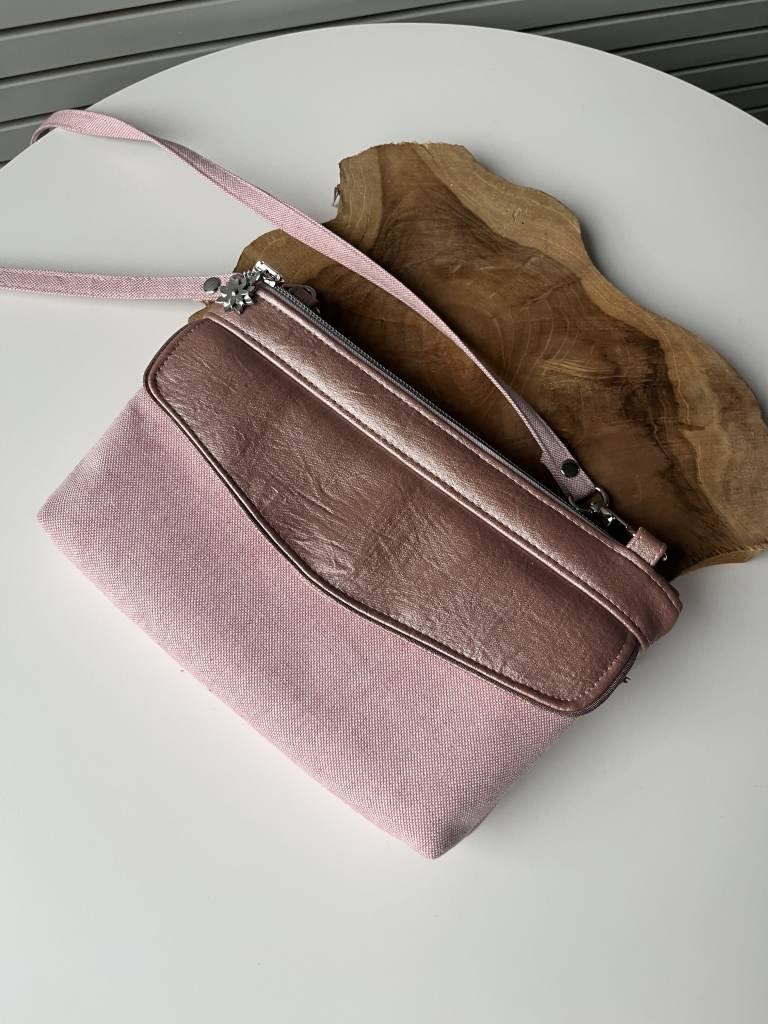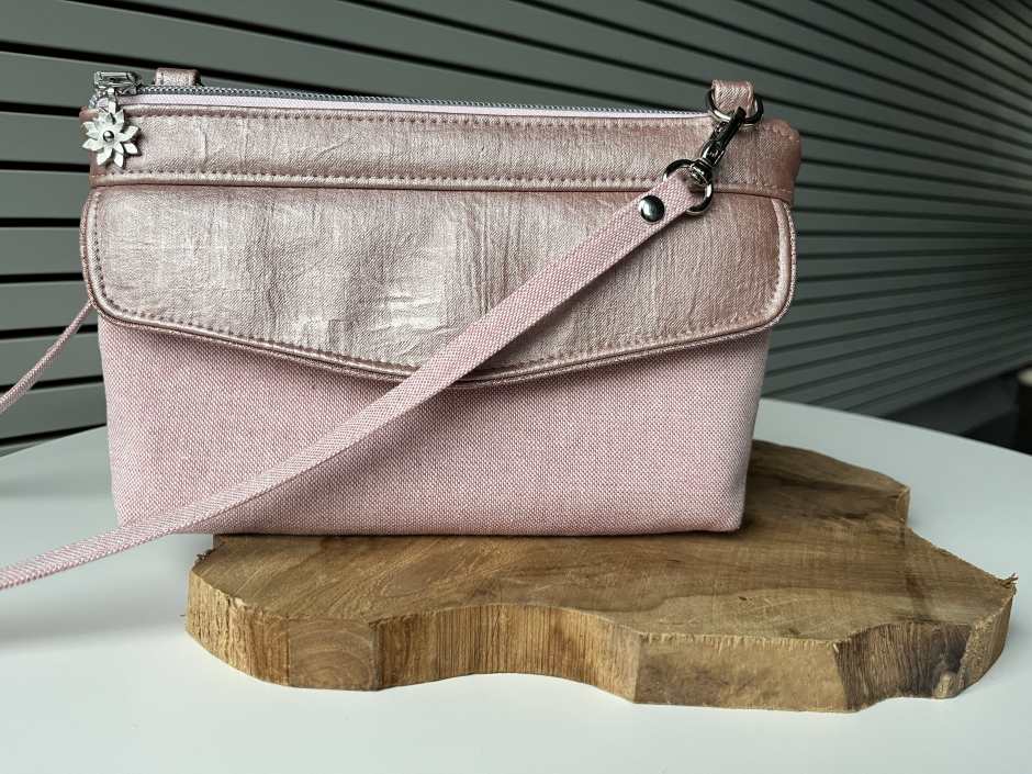 Voor dit zachtroze exemplaar gebruikte ik een allerlaatste stukje kunstleer dat ik ooit kocht bij Toverstof. Ik combineerde het met zachte canvas van ZipperZoo. Op het moment dat ik deze tekst schrijf, is de stock van ZipperZoo verhuisd naar Serial Bagmakers en worden deze twee merken één. Dat komt me goed uit, want in haast alle tassenprojecten combineer ik materialen van mijn twee favoriete shops. Zo ook in dit tasje, want de hardware komt van Serial Bagmakers. De leuke roze metallic paspel (rond de klep) kocht ik bij Veritas, maar jammer genoeg is die daar nu niet meer te vinden.