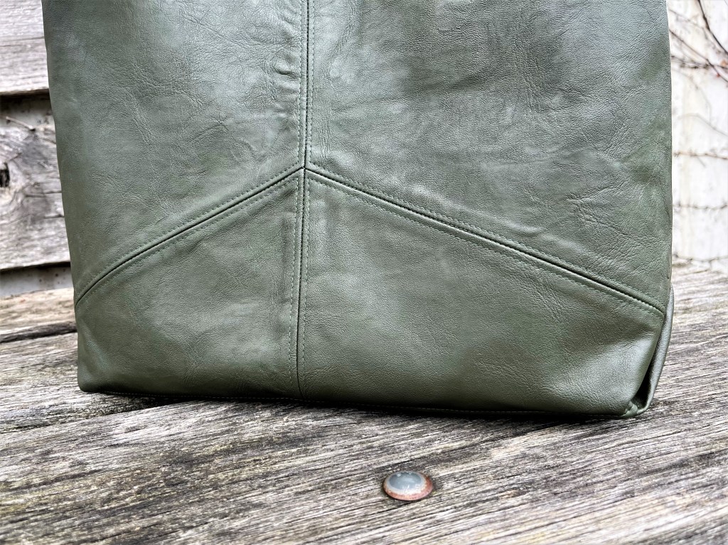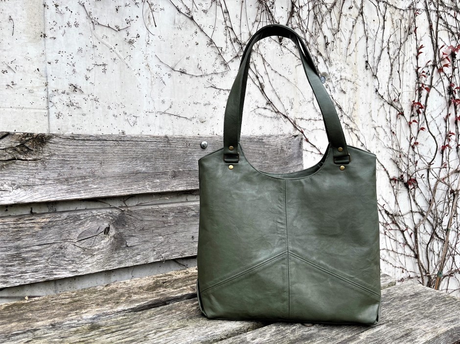 Ik viel vooral voor de mooie belijning van het voorpand, die zowel bij tassen in verschillende kleuren als bij tassen in één kleur heel mooi tot z’n recht komt. Het achterpand is normaal gezien in één stuk, maar ik besloot de twee kanten identiek te maken. Wat meer werk, maar zo heb je eigenlijk twee voorkanten en dat vind ik mooier.