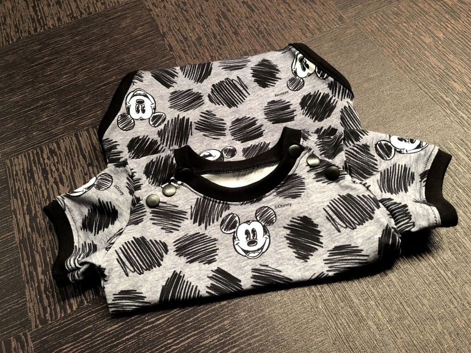 In mijn stoffendoos lag een restje van een leuk Mickey Mouse tricotje (ik kocht het bij De Stoffenknop) waarmee ik al eens eerder zo’n schattig rompertje maakte. Ik veranderde een paar details, zoals de kamsnaps en het zwarte buikzakje, maar voor de rest werd het min of meer hetzelfde pakje.