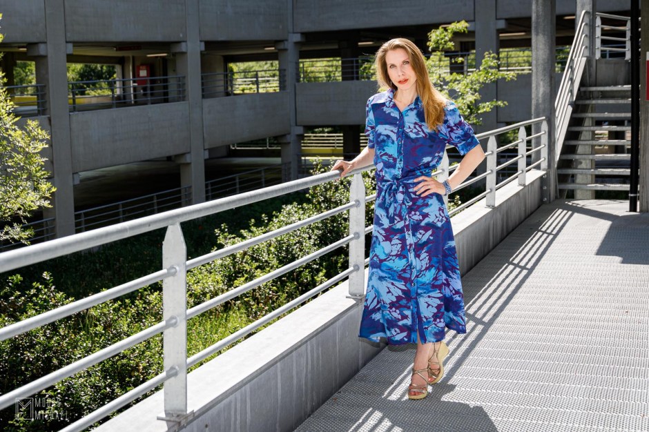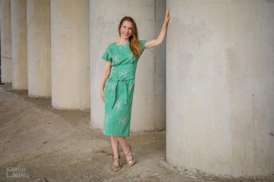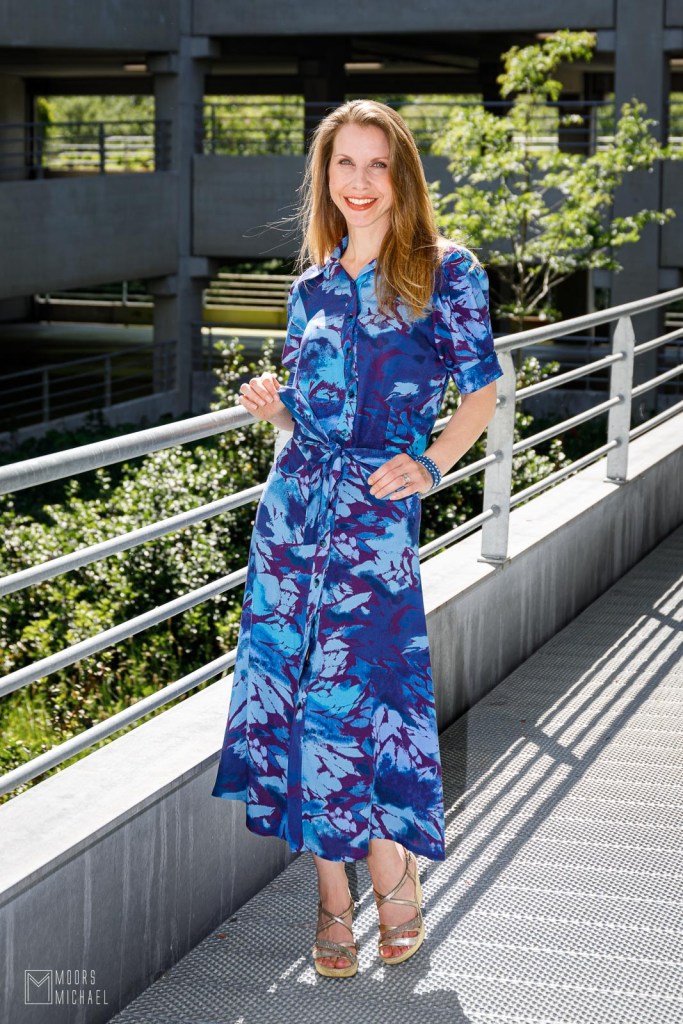 Het patroon vraagt om satijn of viscose, maar ik koos voor een iets minder geschikte stof: een gesatineerde stretchkatoen van Minerva. ‘Iets minder geschikt’ omdat de stof stijver uitviel dan ik had verwacht, maar noch tijdens het naaien, noch in het eindresultaat heeft het mij gestoord. Door de lichte stretch in de stof vind ik de blouse net erg aangenaam om te dragen. Door de lichte satijnglans komt de print prachtig tot leven.