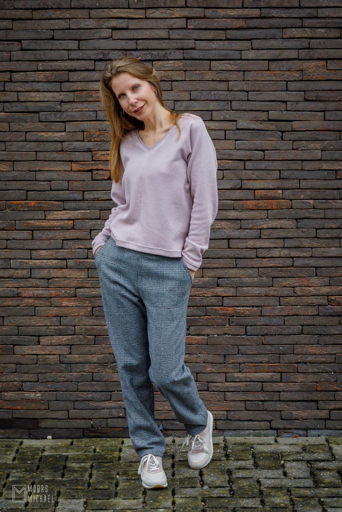 In de Knipmode van mei 2024 (Nvdr.: die in april in de winkel lag) viel mijn oog meteen op bloesje nummer 19, een top van geweven stof, met overslageffect en kraag-op-staander. Knip beschrijft het heel mooi op de site: “Door het glanzende satijn ziet deze top er luxueus uit. Het verkorte model staat extra goed op een broek of rok die hoog in de taille valt”.