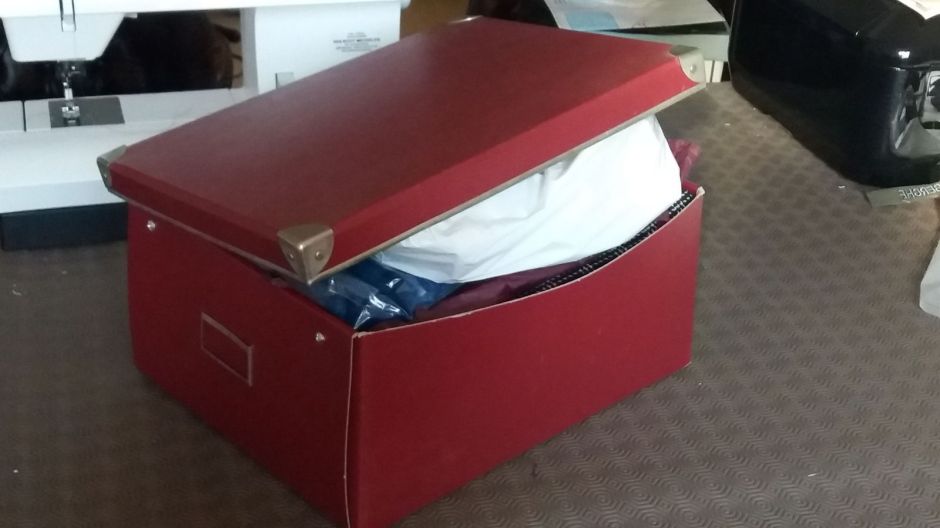Deze grote schoenendoos moet mijn hele stoffencollectie herbergen. Ja, echt waar. Wil ik een mooi stofje kopen, maar is de doos vol? Dan moet ik eerst plaats maken door een stofje te gebruiken, of desnoods weg te geven. Een uitpuilende doos geeft onmiddellijk het gevreesde GSMK-alarm: Geen Stofjes Meer Kopen. Een alarm waarvan elk van ons het direct benauwd krijgt.